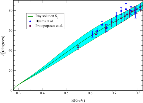 Soon after the original article of Roy [1] had appeared, extensive phenomenological applications were performed [2]–[8], resulting in a detailed analysis and exploitation of the then available experimental data on scattering. For a recent review of those results, we refer the reader to the article by Morgan and Pennington [9]. Parallel to these phenomenological applications, the very structure of the Roy equations was investigated. In [11], a family of partial wave equations was derived, on the basis of manifestly crossing symmetric dispersion relations in the variables and . Each set in this family is valid in an interval , and the union of these intervals covers the domain (for a recent application of these dispersion relations, see [12]). Using hyperbolae in the plane of the above variables, Auberson and Epele [13] proved the existence of partial wave equations up to . Furthermore, the manifold of solutions of Roy’s equations was investigated, in the single channel [14]–[16] as well as in the coupled channel case [17]. In the late seventies, Pool [18] provided a proof that the original, infinite set of integral equations does have at least one solution for , provided that the driving terms are not too large, see also [19]. Heemskerk and Pool also examined numerically the solutions of the Roy equations, both by solving the equation [19] and by using an iterative method [20].