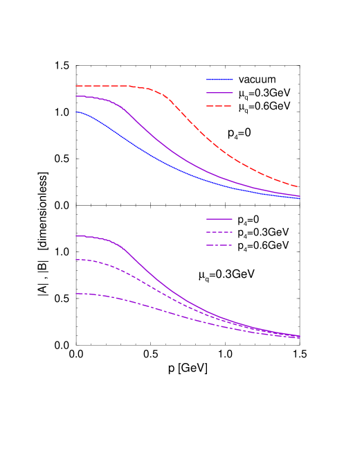 (), for each in- and outgoing quark line with GeV as a typical ’chiral’ scale (variations within such parametrizations do not affect our qualitative conclusions in this section). The coupling constant fm2 is calibrated to a constituent quark mass of GeV in vacuum. Note that there is no well-defined way of introducing density dependencies into the interaction. Since at finite the relevant quark interactions occur at the Fermi surface, a formfactor of type (32) implies the loss of interaction strength with increasing .
