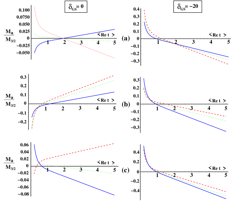 Since , the corrections in (A.19) can be significant if and are all order one. The moduli dependence of in (A.17) follows from perturbative modular invariance.181818Modular invariance could be broken in if corrections to from string nonperturbative effects are moduli dependentΒ [35]. We have ignored this possibility throughout. To the extent that modular invariant condensation dominates supersymmetryΒ breaking, one gets essentially the BGW model with negligible contributions from . On the other hand if is dominant, the corrections found in (A.19) again become negligible. They are significant only if there are two comparable sources of supersymmetryΒ breaking. Even in this case they are unimportant in the large limit if is not too large. Note that the correction to the A-term does not vanish at the self-dual points for the moduli, so in this case we would not get an βanomaly mediatedβ scenario at these points when . In the chiral formulationΒ [1], there is mixing between dilaton and moduli F-terms. In that language, the corrections to the results of SectionΒ 2, aside from the rescaling of , arise from terms proportional to h.c. in the potential.