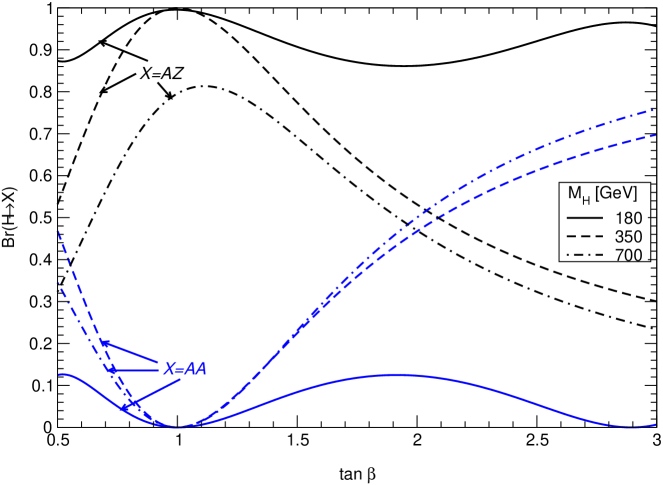 In addition to the channel, a heavy CP-even Higgs boson can also decay into the mode with a sizable branching ratio. The partial decay width for is