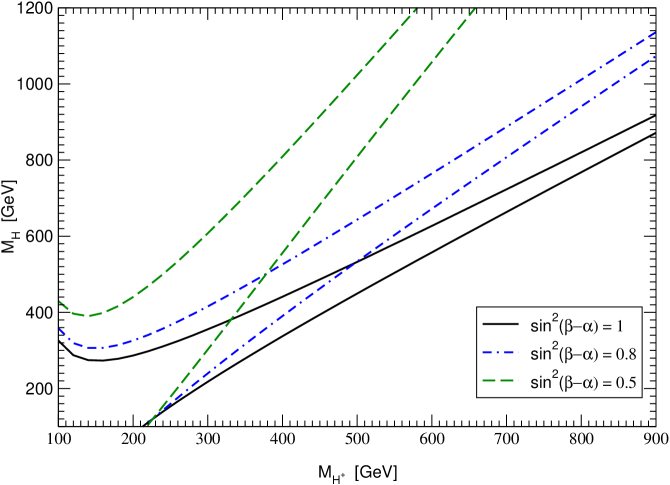The effect of scalar fields (, , and ) on have been reported for a general THDM in the literature [23, 24, 25]. When becomes negligible, the contribution to can grow quadratically with the masses of the other scalars (See the appendix of Ref. [25]). The only way to keep small is to have cancellations among potentially large loop contributions from each Higgs boson. For example, as , this cancellation can take place between the contributions from and , and requires a certain correlation between their masses. ( is the mixing parameter between the two CP-even Higgs bosons and .) As shown in the appendix of Ref. [25], this correlation depends on the value of the coefficient . In Fig. 4 we show the different allowed regions in the versus plane for three different values of . These regions or bands correspond to the 95 % CL limits for [25] with