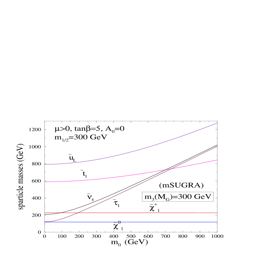 Motivated by the fact that is the most favored zone for unification (see Fig.Β 1) we compare the sparticle mass spectra in mSUGRA with the one arising in the 24-plet nonuniversal case in Figs.4 and 4. Since the gauge sector produces important renormalization group effects on the sparticle masses we have chosen identical values in Figs.4 and 4 for a direct comparison. Thus for and fixed we find that the squark and slepton masses undergo a relatively small change as we go from Fig.(4a) to Fig.(4b) but a relatively large change is seen in the lightest neutralino mass due to the very different ratio of the and gaugino masses for the 24 plet case compared to the mSUGRA case. Having identified the signature of the 24-plet nonuniversal scenario on the mass spectra as given by Figs.(4a) and (4b) we now study the sparticle spectrum in the most favored unification region under the constraint and the limits. The result is exhibited in Fig.4. The choice of parameters in Fig.(4c) is based on the fact that the requirement of unification along with the constraint prefers the parameters , Β TeV and . The choice Β GeV (see Fig.1) is guided by the fact that the constraint is most easily satisfied for this value of . In Fig.(4c) ranges between to . Regarding the sparticle spectra we note that as in Fig.(4b) the lightest neutralino mass is much smaller relative to the mSUGRA case of Fig.(4a). Another interesting phenomenon is that because of the large value in this case there is a large L-R mixing in the stop mixing matrix resulting in significantly smaller here relative to that in Fig.(4b). More generally the third generation scalar sector is relatively lighter. Finally, most importantly, while considering between 400 to 800 GeV which is the favored region for satisfying all the constraints (see Fig.1) we see that the spectrum in Fig.4 is well below a TeV. Thus the naturalness requirement is preserved (see, e.g., Ref.[30]).
