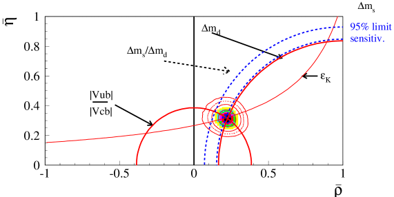 The experimental value of specifies a hyperbola in the plane. This is shown in Fig. 6 CKM:02 , together with the constraints obtained from , - mixing and the experimental bound on . This figure assumes CKM:02 , MeV and .