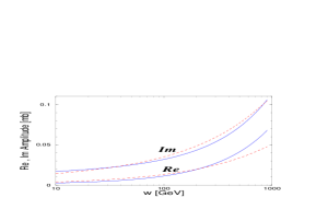 The FKS model has a larger contribution from large dipoles than the MFGS model although the forward amplitudes obtained by integrating over are similar. We assume the usual exponential dependence of the differential cross-section and use a value of §§§This is the value used by H1 in their analysis. for the slope parameter to calculate the photon-level total cross-section, . The theoretical predictions, which include the small contribution of the real part of the amplitude, are compared to H1 data points in Fig 2. We reconstruct the real amplitude using analyticity. The FKS amplitude being a sum of two Regge terms, the real part is easily computed using the signature factors. As for the MFGS amplitude, we have to do a two power fit to the imaginary amplitude first. The FKS real amplitude shows a steeper energy dependence at very high energies as can be clearly seen in Fig 3.