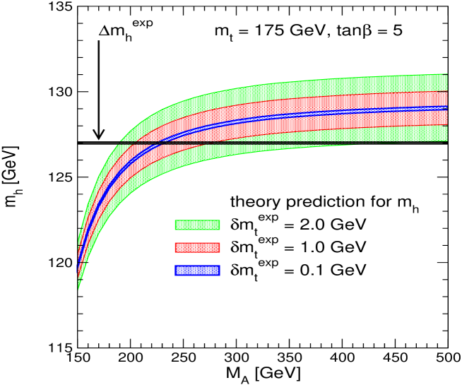 Since these very large corrections are proportional to the fourth power of the top quark mass, the predictions for and many other observables in the MSSM Higgs sector strongly depend on the value of . As a rule of thumb [40], a shift of induces a parametric theoretical uncertainty of of also about , i.e. .