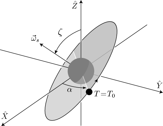 Under the circular approximation, the parameters of the Earth’s orbit are the mean orbital radius and the mean orbital angular frequency . The mean Earth orbital speed is . The parameters for a circular satellite orbit around the Earth are taken as the mean orbital radius , the mean satellite orbital angular frequency , the angle between the Earth’s rotation axis and the satellite orbital axis, the azimuthal angle between the satellite and the Earth orbital planes, and a conveniently chosen reference time at which the satellite crosses the equatorial plane on an ascending orbit. See Figure 2. It is also useful to introduce the satellite time measured in the Sun-based frame, . Note that the mean satellite speed with respect to the Earth’s center is . For special limiting orbits, reduces to the usual sidereal frequency fn3 . Note also that various perturbations typically cause to precess.