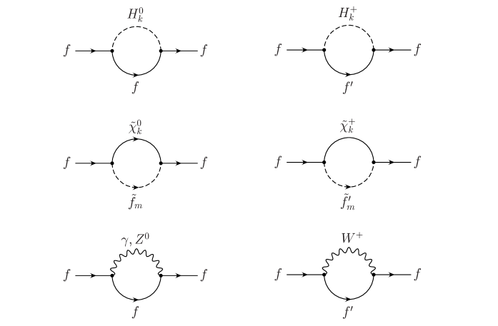 where the sub–/superscript denotes values belonging to first and second generation scalar fermions with same isospin as (e. g. for the stop case, …), sfermions with different isospin etc.