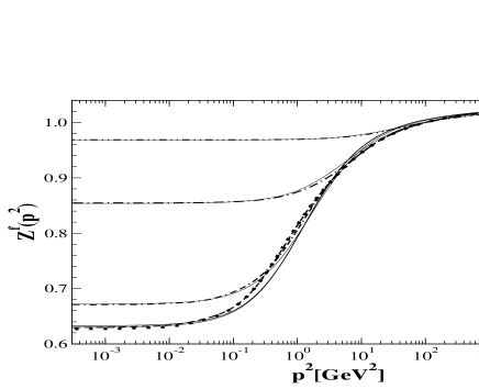 where is a scalar function extracted from the corresponding propagator. For the propagator of transverse gluons, is simply given by the renormalization function times the tree-level expression (see Eq. (14) below) and we denote the corresponding Schwinger function by . The quark propagator can be decomposed into a scalar and a vector part