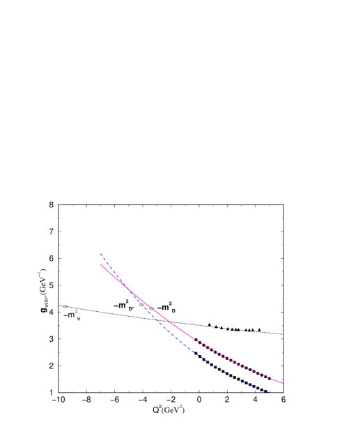 These fits are also shown in Fig.Β 4 through the dotted, dashed and solid lines respectively. From Fig.Β 4 we see that all three form factors lead to compatible values for the coupling constant when the form factors are extrapolated to the off-shell meson masses (open circles in Fig.Β 4).