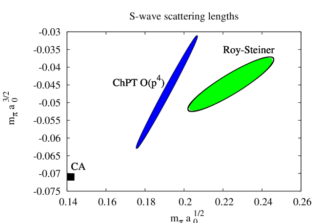 Scattering amplitudes of pseudo-Goldstone bosons at low energies probe with a unique sensitivity the scalar-source sector of Chiral Perturbation Theory (ChPT) [1, 2]. For instance, recent progress in the domain of scattering has provided valuable information on the chiral limit where the masses of the quarks are set to zero. For this purpose, the Roy equations, which have been extensively studied in the past [3, 4, 5], were re-analyzed [6] (in particular, a formulation as a boundary value problem was developped) and solved numerically [6, 7] (see also [8]). These equations constrain the low-energy -scattering amplitude by exploiting simultaneously theoretical requirements and data at higher energies. New data on decays from the E865 experiment [9] could thus be studied with the help of the solutions to the Roy equations and a bound on the coupling constant of the chiral Lagrangian [10] was derived for the first time. Constraints on the quark condensate were also obtained along similar lines [11].