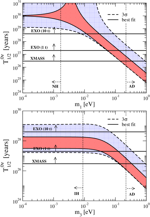 The predictions for can be obtained by using the present data on the oscillation parameters. Its value depends strongly on the type of neutrino mass spectrum and minimal neutrino mass [27, 28, 29, 30, 31, 32, 33, 34, 35, 36].