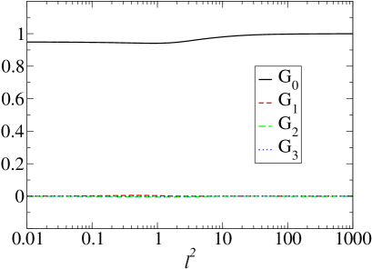 In this section we present numerical results for the components of the 4-pt function . In what follows we use the parameters , , , (taken from me02 ) and we set . The (rainbow truncated) quark propagator functions are the same as in ref. me02 . Looking at the form of the kernel Eq. (LABEL:eq:kern1) we need to evaluate the functions at () and , where is the complex mass solution of the Bethe–Salpeter equation, and are spacelike momentum integration variables.