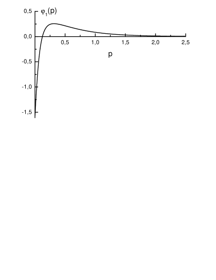 In Fig. 3, we represent the solutions of the bound-state problem for the pion with the harmonic oscillator confining potential, Eq. (51), for the two lowest solutions to the mass-gap equation (13) depicted in Fig. 2 — for the ground BCS vacuum (the left plot in Fig. 3) and for the first replica with the reversed sign of the chiral angle (the right plot in Fig. 3). It is clearly seen from Fig. 3 that the pionic wave functions are indeed very close to (see Fig. 2) with the corrections given by the formula (54). Notice that, after the change performed for odd replicas, the “” and the “” components of the mesonic wave function substitute each other, so that one needs either to redefine the whole set of the operator transformations used to diagonalise the Hamiltonian of the theory in the mesonic sector or, which is more economical, simply to rename to and vice versa.