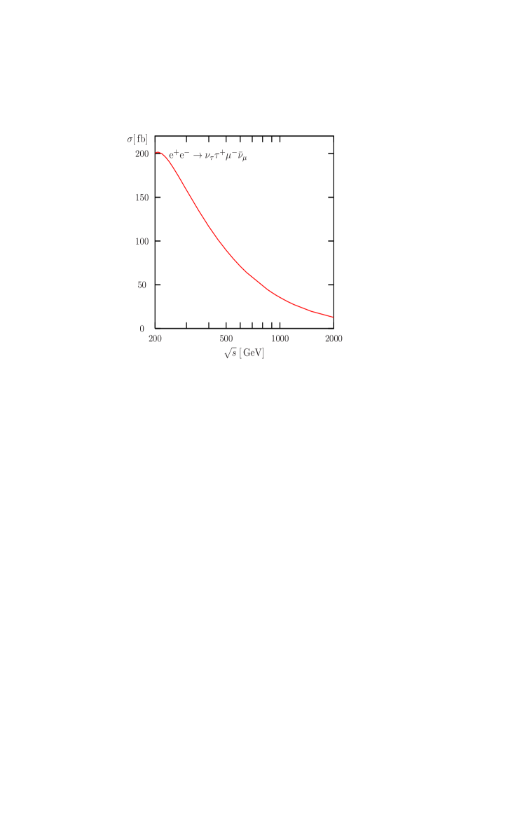 In this paper we present first results of a complete calculation (improved by higher-order ISR) for the final states , , and , which are relevant for W-pair production.111Electrons and/or positrons in the final state are not yet considered; they deserve further refinements, in particular the inclusion of finite-electron-mass effects in the domain of forward-scattered . We also do not yet include final states that can also be produced via two resonant Z bosons, so called mixed CC/NC reactions. These can be taken into account in lowest order in RacoonWW. The actual calculation is rather complicated.222Some of the problems appearing in a first attempt of such a calculation were already described in Ref. [18]. Recently the authors of the GRACE/1-LOOP system reported on progress towards a full one-loop calculation for in Ref. [19] so that one can expect that the system will be able to deal with processes at one loop in the near future. Technically the occurring one-loop tensor integrals comprise 5- and 6-point functions up to rank 3, and conceptually the W-boson resonances require a treatment in loop diagrams that preserves gauge invariance. Details of our approach will be described in a forthcoming publication; in the next section we just sketch the most important features of the calculation. In Section 3 we present explicit numerical results on total cross sections for scattering energies from near the W-pair-production threshold up to . Particular attention is paid to a comparison with the DPA and IBA approaches used at LEP2.