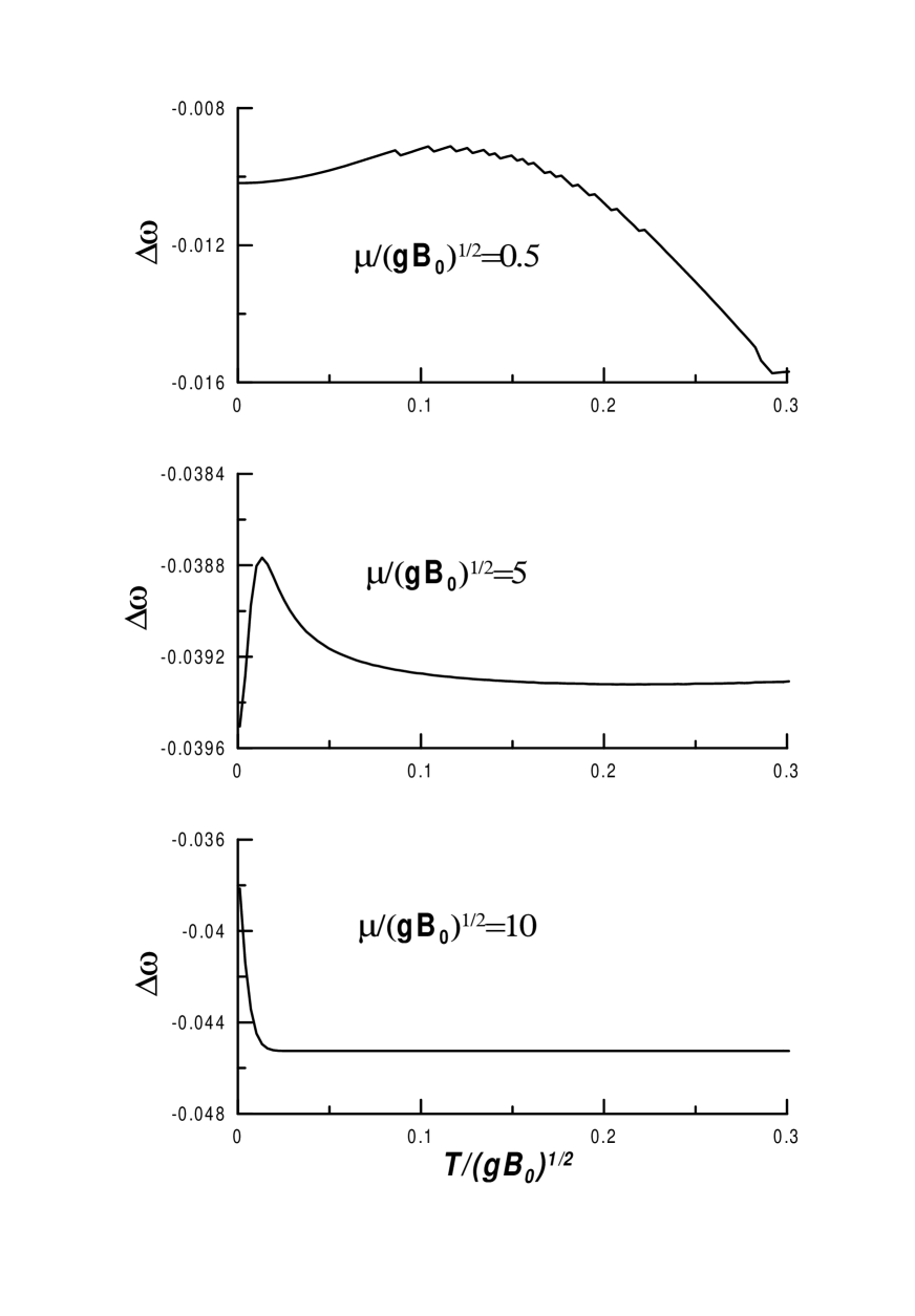 Now in the case of finite temperature, we also use a numerical calculation method, which gives only approximate results, as we have to deal with an infinite series over the fermion energy levels. The results are shown in Figs. 3 and 4.