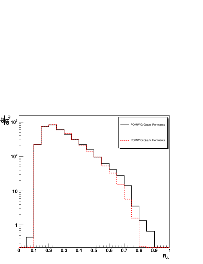 The treatment of the pomeron remnant can also have an effect on the POMWIG predictions at high . As discussed in section 2, POMWIG v1.3 introduces the option of defining the pomeron valence partons to be either quarks or gluons. Since in the H1 picture, the pomeron is predominantly a gluonic object, the more natural choice is to define the valence partons to be gluons. In figure 8 we compare the distributions when the pomeron valence partons are defined to be quarks (the POMWIG default behaviour prior to v1.3) or gluons. The POMWIG prediction is significantly lower at high for the quark case. This is because in di-jet production, the parton entering the hard scatter from the pomeron is more likely to be a gluon. If the valence partons in the Pomeron are defined to be quarks, HERWIG will be forced to continue parton showering until a quark-antiquark pair is produced. This results in increased activity in the remnant region, and hence high values are less likely.