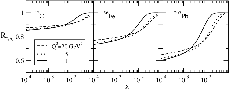 Our interest is in the well evolved shadowing at , the onset of NS at must be treated within the light-cone Green function technique [17, 18], here we show only the gross features of the large- suppression of NS following the prescriptions from Refs. [16, 19] and the -dependence of the large rapidity gap DIS as predicted in [20] and confirmed in the HERA experiments [21]. We use the free-nucleon CD cross section tested against the experimental data from HERA, it is described in [7]. We calculate as a function of for several values of . Our results obtained for realistic nuclear densities of Ref.[22] are presented in Figure 1. Shown is the ratio for different nuclear targets including . At small and high the shadowing correction scales, . The absorption cross section scales as well. The ratio slowly decreases with growing because of the logarithmic scaling violation in . Toward the region of , both the nuclear form factor and the mass threshold effect suppress the shadowing correction at (see Fig.1).