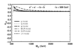 A first difference between the theoretical models can be found in the forward-backward asymmetries () in , with and . These fermion couplings to allow a clear model separation from other extended models. We have performed the calculation with the CompHep package HEP , in which the previously mentioned models were implemented. The curves for are displayed in Figures 2,3 and 4 for the models cited above: LHM with a choice of the mixing parameters , ; superstring inspired models and Symmetric and Mirror left-right models as a function of (and ) for GeV. Near the resonant region ( GeV ) some models are more sensitive than the LHM, presenting sizeable deviations from the SM value . The same behavior occurs for TeV. For larger values of the mass of the new gauge boson, the combined analysis of , and pair production might help to establish the best model underlying these deviations from the SM predictions.
