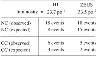 The H1 and ZEUS collaborations initially observed an excess over SM expectations of neutral current events in deep inelastic scattering. However, after further running, the effect has become less compelling. Table 4 summarizes the present situation in both neutral current (NC) and charged current (CC) channels. The H1 NC data show an enhancement in the jet invariant mass bin GeV; see Table 5. This could be an indication of an -channel resonance in the NC channel or it could just be a statistical fluctuation.