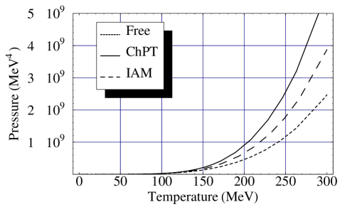 Thus, from the phase-shifts coming from standard ChPT and from ChPT complemented with the IAM method, together with Eqs.6 and 12 we can obtain the second virial coefficient. Using Eq.1 we can therefore compute the value of the pressure as a function of and . We show the results in Fig.3. In particular, we plot the pressure dependence on the temperature for , which is well within the applicability range of the virial approach (This case is interesting since it corresponds to the canonical ensemble [6]). One of the three curves is the free-pion gas and the other two the interacting case both using standard ChPT or ChPT with the IAM.