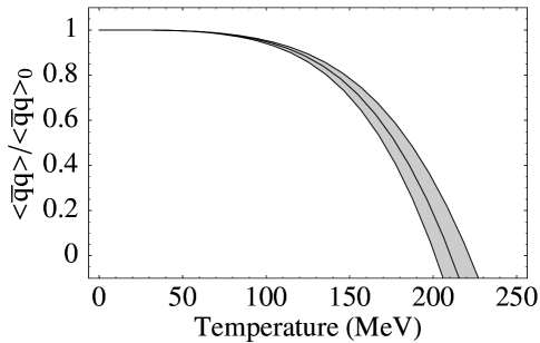 Figure 5.- Evolution of the chiral condensate with the temperature at . The shaded area covers the uncertainties in the different parameters, that have been explained in the text.