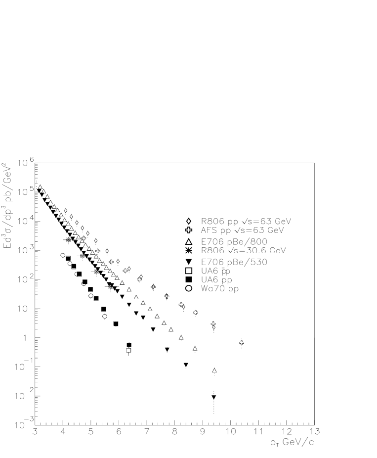 The agreement of theory with both data sets is rather good for Β GeV/c, although the theoretical expectations tend to be somewhat higher than the data, a situation which is different from the fixed-target case. This fact may be related to the observation made above concerning the energy variation of the data-over-theory ratio. This can be checked, to an extent which is limited by the relatively large error bars, by comparing the fixed-scale theory to the three sets of R806 data at , 44.8 and 62.8Β GeV. We find that, at fixed , this ratio tends to decrease when the energy increases, in agreement with the E706 results.