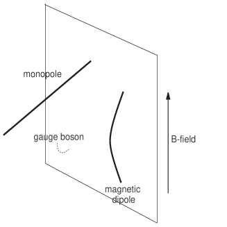 The magnetic monopoles are not part of the physical spectrum as, being represented by semi-infinite D-string ending on the D3-brane, they are counterpart of the Dirac magnetic monopole with an infinite self-energy. Among the physical excitations, however, are magnetic dipoles (as well as their dyonic counterparts) composed of monopole-antimonopole pair. See figure 1. Consider an open D-string (lying entirely on the D3-brane) of length . It represents a magnetic dipole carrying a dipole moment (measured in string unit) and total mass