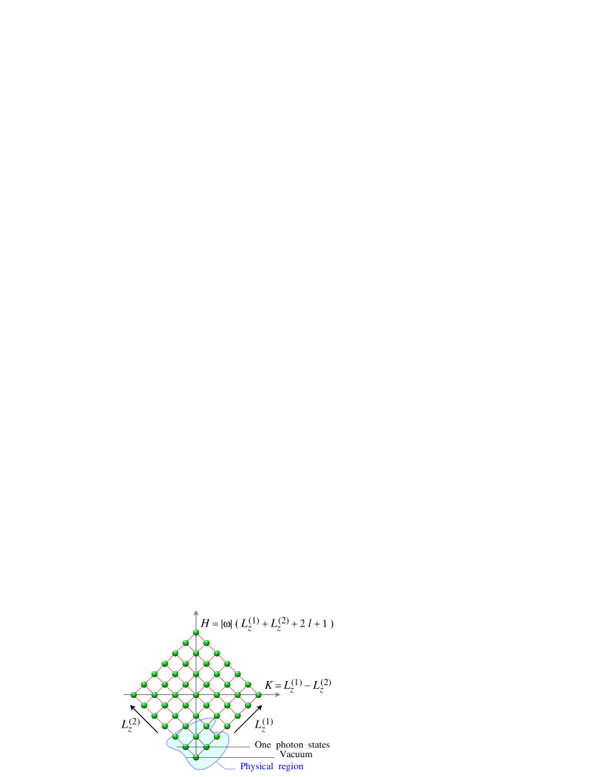 States with contain -photons, whose total spin ranges from to . This is the range of the operator . Thus, we have to arrange the states in accordance with their spin values along the axis of the momentum variable (which we take to be the -axis). This way, the energy eigenstates of our circular degrees of freedom will automatically also be eigenstates of transverse rotations. We are lead to consider the field modes , each of which has positive and negative frequencies: