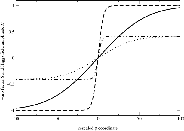 This system of equations must be supplemented with boundary conditions. By definition of the topological defect like configuration, we require that the Higgs field vanishes on the membrane itself, i.e., for , while it recovers its VEV in the bulk, so that . Note that the sign choice made here is arbitrary and corresponds to the so-called kink solution ; the opposite choice (i.e. ) would lead to an anti-kink whose physical properties, as far as we are concerned, are exactly equivalent. As for the metric function , it stems from the requirement that one wants to recover anti-de Sitter asymptotically, so that one demands that tends to a constant for . This constant can be determined using Eq. (9), so that . Note that as changes sign at the brane location, there is no choice for the sign of the function in this case. Note also that, as is well known, the static hypothesis implies that the bulk cosmological constant must be negative, and therefore the five dimensional spacetime to be anti-de Sitter.