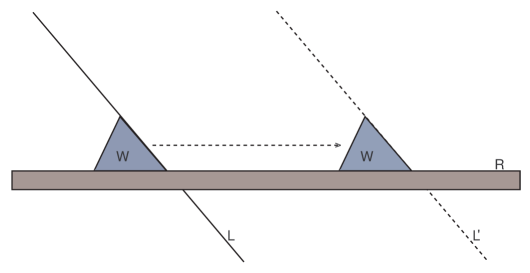 Of course parallelism can be reduced to metricity. As we learned in school, one can draw a parallel to a line L using a right angled triangle (W) and an unmarked straightedge (R): One aligns one of the short sides of the triangle with the straight line and rests the other short side on the ruler. Then, one slides the triangle to where the parallel is to be drawn, as in Fig.3.