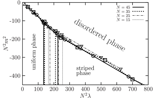 We considered this model in with two NC coordinates, and simulated the corresponding matrix model (described in Section 1) at and 45. Thus we obtained the explicit phase diagram shown in Fig. 3. It is based on the order parameter