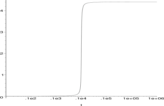 Concentrating on the embedding modulus we are left with the following picture. We start with a constant denoting a lump of valued gauge field which is sitting in some part of the larger gauge group and breaking a corresponding part of the symmetry. Then, at some time , suddenly changes and the instanton’s embedding within the gauge group rapidly changes to reach a final embedding where it again ‘comes to rest’. Thereafter the gauge field configuration is again sitting in some subgroup of the larger gauge group but this subgroup is embedded differently to the original one. Correspondingly the valued expectation value of the gauge field is now breaking a different part of the gauge symmetry. In other words at time there is a rapid change in the embedding modulus which results in a change in the unbroken gauge symmetry seen in four dimensions. An example of the evolution of , for the same choice of integration constants as was used in figure 1 is provided in figure 2.