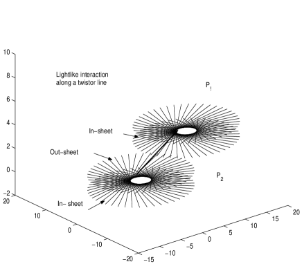 Indeed, since the complex world line is parametrized by the complex time parameter , it represents a stringy world sheet. However, this string is very specific, it is extended along the imaginary time parameter . The world lines and are the end points of this open complex twistor-string BurStr ; BurOri ; BurTwi ; BurPra , see fig.1. By analogue with the real strings where the end points are attached to quarks, one can conventionally call these complex point-like sources as ‘quarks’.
