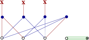 In the figures, we will follow the following conventions. The filled dot indicates a bulk insertion, the unfilled dot represents an insertion, the cross is a insertion and an open circle with a dot represents the three fermion zero-modes. Bosonic propagators are represented by a brown line while fermionic ones are represented by a blue line. We will indicate by , the group-theory factor that the graph represents and , the combinatoric factor associated with the graph, i.e. the number of ways that the given graph can be obtained.