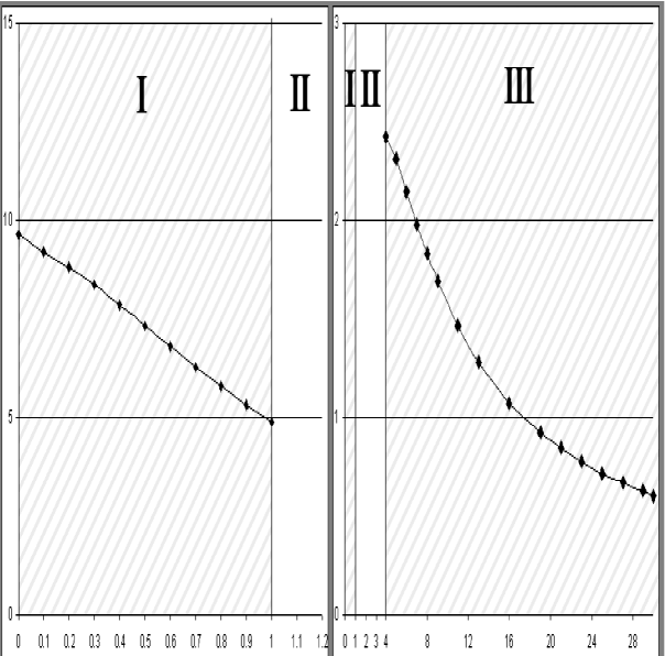 Figure 2 delineates three regions of for which an orbit that begins at the turning point exhibits a specific kind of behavior. When (Region I), the period is a smooth decreasing function of ; when (Region II), the period is a rapidly varying and choppy function of ; when (Region III), the period is once again a smooth and decreasing function of . For some values of in Region II the period is extremely long. Thus, it is difficult to see the behavior of the period in Regions I and III in Fig. 2. We have therefore plotted in Fig. 3 the period for these slowly varying regions.