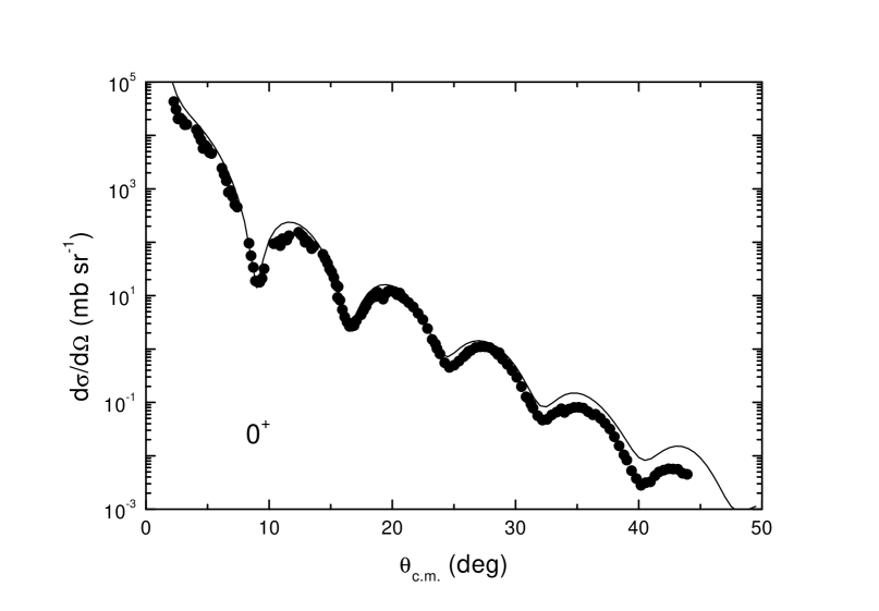 where and . The fitting procedure is similar to that employed in [12] for the nucleus. The oscillator parameter has been set to 2.2 fm. is a generalised Laguerre polynomial of order . The unknown coefficients have been obtained by fitting the calculated differential cross-sections for the nuclear levels in question to the experimental data of [3, 11]. The analysis includes a high- bias and an estimate of the incompleteness error that results from limitation of the data to finite momentum transfer. A tail bias is used to damp unphysical oscillations of the density for , where it is assumed that is beyond the match radius . The parameter is adjusted to the fitted density at the match radius . The fits to the cross-section data are displayed in Fig. 2. The LGE expansion coefficients for the neutron transition densities in question are tabulated in Table 1. The fitted neutron transition densities presented in Fig.3 are compared with proton transition densities for the same levels. In Fig. 2 the dash curve also represents the calculated cross-sections in the approximation of a pure isoscalar character of the excitations. It can be seen there from the comparison with experiment that this approximation is unacceptable. The transition strength is customarily characterised by the moment