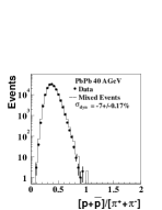 The systematic error of the fluctuation measurement is estimated by comparing results when using two different track quality cuts. The values of the fluctuation signal presented here are calculated as the arithmetic mean of both results. For illustration the distributions of the two studied particle ratios at 20, 40 and 158 GeV are shown in Figs. 2 and 3. The contribution from dynamical fluctuations obtained from Eq. 1 is plotted in the Fig. 4. Fluctuations of the ratio are positive and decrease with beam energy. In case of the ratio the width of the data distribution is smaller than the width of the distribution of mixed events. The dynamical fluctuations are negative. A negative fluctuation signal of the event wise ratio can be understood, if resonance decays into pions and protons are considered. The magnitude of the negative fluctuation signal in the channel may be related to the relative contribution of resonance decay products in the final state of the collision. In order to estimate the significance of the observed fluctuation signals of the two ratios considered, we compare the data to a string-hadronic cascade model UrQMD [11]. In this model, by construction, no fluctuations due to a potential phase transition are present, while resonance decays are included as well as effects of correlated particle production due to quantum number and energy/momentum conservation laws. For this study, large samples of UrQMD events were generated at all five beam energies and then subjected to an acceptance filter modeling the NA49 detector system. The accepted final state particles were counted and the corresponding ratios were formed.