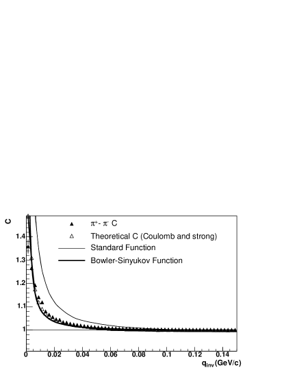 As a consistency check for the Bowler-Sinyukov procedure, we calculated the correlation function, dominated by Coulomb interaction, and compare to different calculations. In Fig. 6 lines indicate the standard () and Bowler-Sinyukov () Coulomb functions where was extracted from the fit to the 3D like-sign correlation function. This latter is the same as dilution for unlike sign pions and takes into account the percentage of primary pions through . Clearly, the Bowler-Sinyukov function (thick line) better reproduces the data (closed symbols) than the standard function (thin line). The small discrepancy between the Bowler-Sinyukov function and the data disappears when strong interaction (negligible for like-sign pions) is added to the Bowler-Sinyukov function as shown by the theoretical calculation LEDNI82 (open symbols). Between identical pions, there is a repulsive s-wave interaction for the isospin I=2 system BOWLE88 . However, the range of this interaction is estimated to be 0.2 fm, while the characteristic separation between pions in heavy ions collisions is 5 fm. Also, there are no doubly charged mesonic resonances that could decay into same charged pions that would strongly interact. For these reasons, the strong interaction will be ignored for like sign particles.