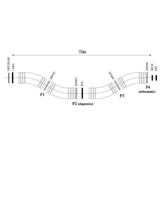 The magnetic dipole fields were measured by Hall probes with an accuracy of B=10-4 T. The dispersion in the central focal plane F2 was determined to be mm/% by measuring the position of the primary beam for several field settings. With a beam spot of mm at the target and a position resolution of the silicon detector at the central focal plane F2 of mm this allowed to determine the momentum for fragments with known ionic charge with an accuracy of 60 MeV/c.