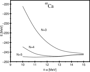 In our calculations the sum in the expansion (6) has been extended up to terms. We have verified that this truncation is sufficient to ensure that the HF results do not significantly depend on the variation of the oscillator constant . This is illustrated in Figs. 1 and 2, where we show the behavior of the HF ground–state energy of 16O and 40Ca versus for different values of . The results for are quite stable. In our calculations the values of have been derived from the expression blomqvist68 , which reproduces the rms radii in an independent–particle approximation with harmonic–oscillator wave functions. This expression gives and 11 MeV for 16O and 40Ca, respectively. In solving Eq. (7), the Coulomb potential has been added to for protons.