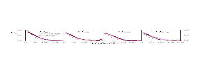 Using the program Correlation After Burner [32], we have evaluated the correlation function of two kaons in their longitudinally comoving frame for central ( fm) Au+Au collisions at GeV. In Figure 1, we show the invariant correlation function, i.e., the correlation function as a function of , and its projections onto one of the and axes. In evaluating the projected correlation function, the other two -components have been integrated over the range MeV/. The dash-dotted curves in Figure 1 represent results from the default AMPT model (no string melting), while the other curves are from the extended AMPT model with string melting but using different values for . It is seen that the one-dimensional kaon correlation functions become narrower as is increased in the extended AMPT model. Their dependence on seems, however, to be much weaker than that of the pion correlation function [9].