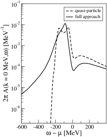 Characteristic differences between the quasi-particle approximation and the full -matrix approach can also be seen in Fig 3, which shows a comparison of the spectral functions for nucleons with momentum in nuclear matter of a density around 0.3 fm-3 at temperature = 10 MeV. While the quasi-particle spectral function tends to zero below , the self-consistent result shows a large tail at negative energies. This redistribution of strength is related to the tail that was found in the imaginary part of the full matrix in Fig 2. In the full calculation one does not constrain e.g. the construction of the self-energy at energies below the Fermi energy to the admixture of two-hole one-particle configurations, as it is done in the quasi-particle approach, but the self-consistent evaluation allows for general n-hole (n-1)-particle configurations. The double-hump structure in the quasi-particle spectral function reflects the fact that, for low lying states, eq. (25) has no unique solution (cf. paragraph after eq. (25)). The self-consistent spectral functions do not show this feature any more. The double hump can be interpreted as an indication for a strong coupling of the one-hole configuration to two-hole one-particle excitations. Obviously this coupling is reduced in the self-consistent calculation.