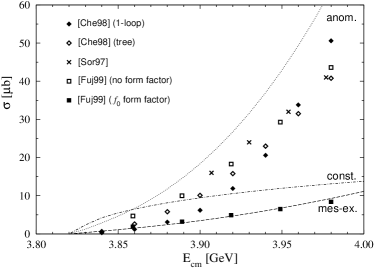 Ideally we would cross an accurate model of the production amplitudes into the scattering regime to estimate closed-flavor cross sections, but this is not yet possible because no model gives a good simultaneous description of all the experimentally observed and dipion mass distributions. For the present we will simply assume the near-threshold dependences suggested by the existing models, and evaluate the cross sections predicted for in each case.
