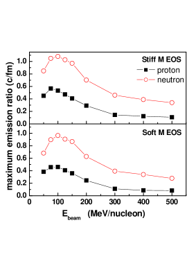In order to discuss the possible origin of the complex behavior of the HBT strength with incident energy, we investigate the maximum nucleon emission rate in the whole time evolution as a function of beam energy in Fig. 15. From the figure, the maximum nucleon emission rates show a rise and fall behavior similar to the one observed in Fig. 15 for the HBT strength. Around 100 MeV/nucleon, the nucleon emission rate is maximum. This energy coincides with the peak position of the HBT strength in Fig. 15. From this point of view, the HBT strength could be correlated to the maximum nucleon emission rate during heavy ion collisions. The higher the nucleon emission rate, the stronger the HBT strength. Of course, another possible explanation for the falling branch of HBT strength can be attributed to the source size in the final state ( = 200 fm/). It is expected that in the energy range of a few hundreds of MeV/nucleon, where the repulsive nucleon-nucleon interaction is dominant, a more dilute system might develop after freeze-out. So the fall of HBT with beam energy above 100 MeV/nucleon indicates that the source size has been much expanded in the final state at higher energies. In contrast, the attractive mean field competes with the repulsive nucleon-nucleon interaction below 100 MeV/nucleon. Shorter emission times with increasing beam energies may play a dominant role in determining the behavior of the HBT strength. Fig. 15 also illustrates illustrates that the emission rate of neutrons is larger than that of protons and that the neutrons are emitted earlier than protons.