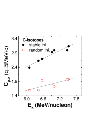 Fig. 1 shows proton-neutron correlation functions from the reactions induced by a chain of C-isotopes projectile on 12C target at 800 MeV/nucleon of incident energy and head-on collisions (impact parameter b = 0 fm) when the suitable selection of the stable initialization is used. In this figure the HBT strength of each isotope in lower relative momentum can be separated. If we plot this strength at 5 MeV/c () as a function of the mean binding energy () of the projectiles (C-isotopes), we find that there exists an approximate linear relationship between and as it is shown by the solid circles in Fig. 2.