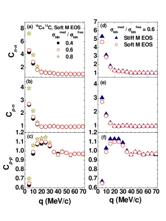 The effect of the in-medium nucleon-nucleon cross section () is discussed in this section. We use a value of which is different from the free nucleon-nucleon cross section () to investigate its influence on momentum correlation functions. Fig. 9 shows NN, NP and PP correlation functions for different and EOS. Slightly larger values of the HBT is found for larger , especially for 0.8 , as well as for the stiff EOS. Fig. 10 shows the HBT strengths at 5 MeV/c (for NN and NP) or at 20 MeV/c (for PP) as a function of in the stiff and soft EOS. The strength increases with and with the stiffness of the EOS. This can be understood by the following arguments: with the increasing of the in-medium nucleon-nucleon cross section, the collision rate between two nucleons increases and consequently the system reaches to the equilibrium stage faster. Before equilibrium is reached, more pre-equilibrium nucleons are emitted, which makes the strength of the correlation function larger.