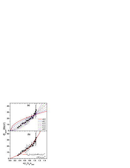 Fig.Β 10 plots the relationship between and after considering the secondary decay. Panel (a) shows the IQMD + GEMINI calculation as a function of average central density , several fits with a constant = 26MeV and different = 0.5, 0.7, 1.0, 1.3, 1.6, 2.0 of equation (18) have been made, in which = 1.3 looks to fit the calculation best in the density region , equation (18) with 1.3 works better in the higher density part. Equation was also adopted in panel (b) to fit the calculation in fig. 10, it can give a good coincidence between the calculation of IQMD+GEMINI and the equation (18) fitting.