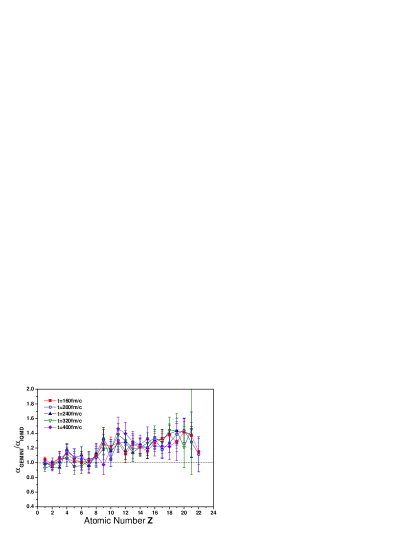 From Equation (14) and (15) the isoscaling slope parameters and can be directly extracted, in this paper only parameter is analyzed, since parameter has similar trend with except that value is negative. In fig. 2(a), parameter as a function of the fragment charge number was printed at several reaction time, one can find that for the light and intermediate mass fragments, such as , value does not change too much with the fragment charge number , but for the heavy fragments, shows different behavior from the light ones, it increases with the fragments charge number . One can also find that the isoscaling parameter presents very small decrease when the reaction time becomes longer, at = 140 fm/ lies on the top, = 400 fm/ locates at the bottom. However, this is suitable only for the light products, and it is opposite for the heavy products though the dynamical effect is not clear.