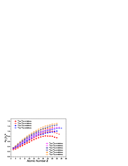 From equation (17) one can notice that if the second order in the exponential function can be neglected, is linear dependence on neutron number for a fixed element with charge number , and value can be expressed as . Fig. 3 shows the centroid and width of Gaussian isotopic distributions as a function of atomic number of the emitted products at different reaction time ( panel (a) - (f)) before and after secondary decay, panel (a) to (d), the difference of in 48Ca + 48Ca system and in 40Ca + 40Ca system increases when atomic number of the emitted products becomes large, in panel (e) and (f) of fig. 3, the width of isotopic distributions does not same in two similar reactions too, it increases with the increasing of fragment atomic number , reaches saturation at some point. In fig. 3(g), is plotted as a function of , here was adopted, it redisplays the behavior in fig. 2, its value raises from the light fragments to heavy fragment, especially in the heavy fragment part, it raises sharply. It decreases in the region of light and intermediate mass fragments with increasing of the reaction time, but opposite trend in the region of heavy fragments. This reveals that neglecting the second order in equation (17) is reasonable in most cases.