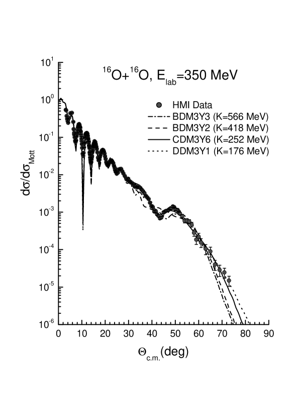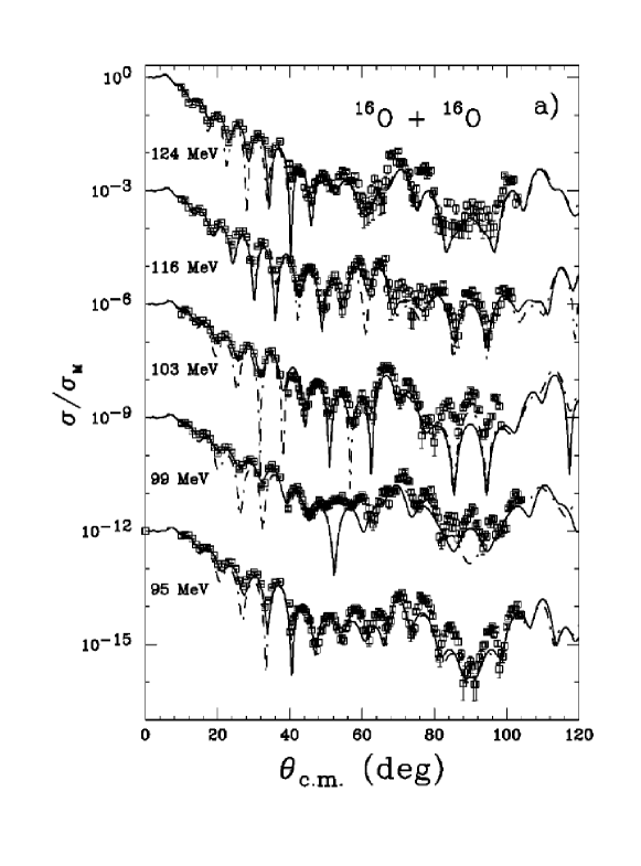 known as ‘Fraunhofer crossover’, where and the nearside/farside interference oscillation reach its maximum amplitude. At small scattering angles () which correspond to peripheral impact parameters, the nearside component is dominant, with positive-angle scattering caused by the repulsion from scattering centre. At large scattering angles () which correspond to small impact parameters, becomes stronger than , with negative-angle scattering caused by the attraction toward scattering centre. Thus, an accurate experimental observation of Fraunhofer crossover would give us a good measure of the refraction and attractive strength of the real OP causing it. The elastic angular distribution is usually characterized by a deep interference minimum in the vicinity of , while the minima become progressively less marked as moves from on either side as shown in Fig. 14. In the 16O+16O case, the measured elastic angular distribution at 350 Mev shows a deep minimum at which is in fact associated with the Fraunhofer crossover given by the realistic OP for this system (see Figs. 13 and 14).